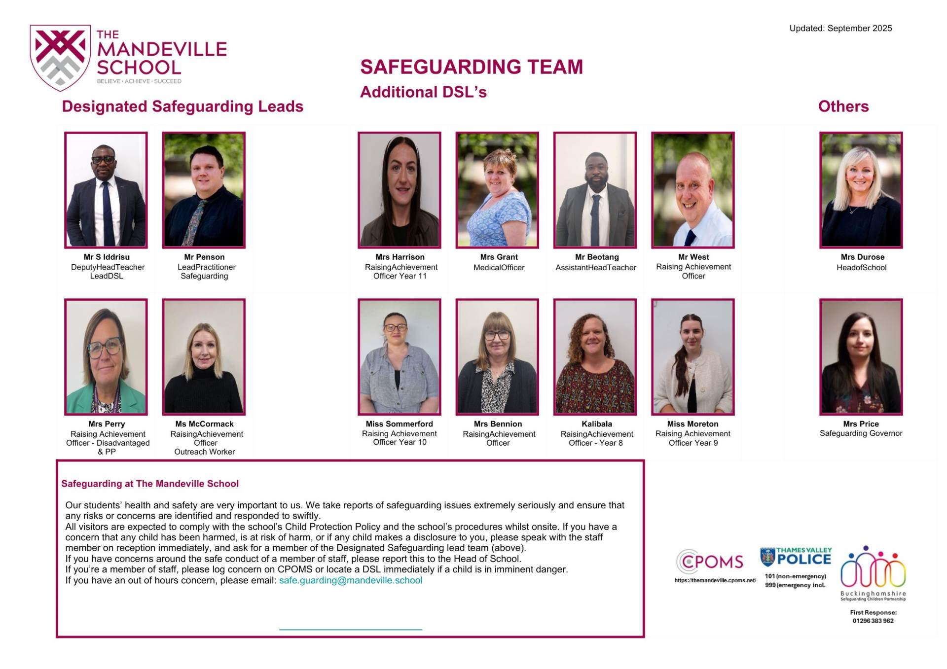 Should you have any concerns about the wellbeing of a young person at The Mandeville School please contact the Safeguarding team on the main school number (01296 745400) or by email at safe.guarding@mandeville.school