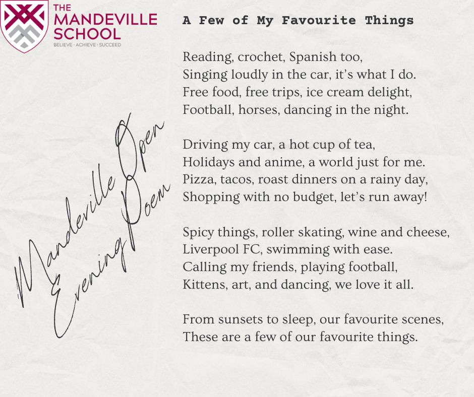 As part of the Open Evening, the English Department embraced National Poetry Day and asked our visitors to do the same by leaving behind suggestions of some of their favourite things.