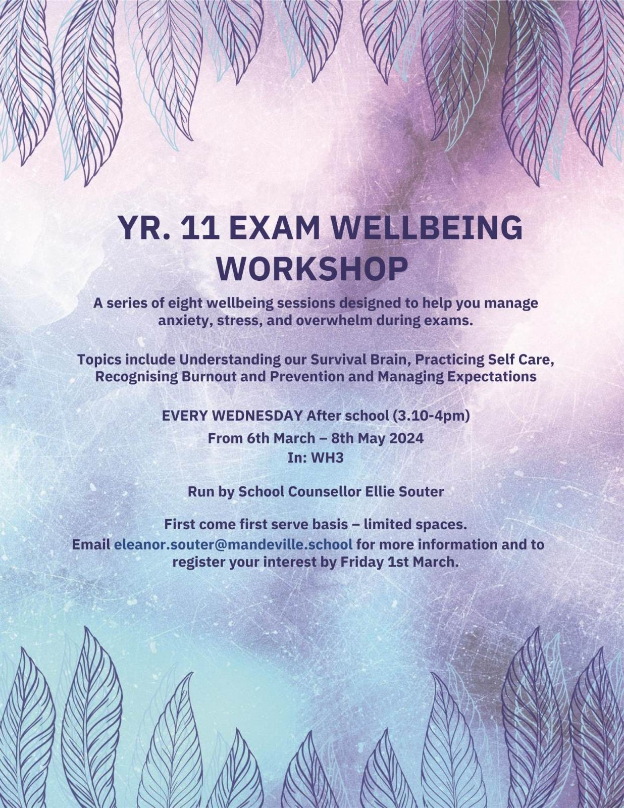 To help our Year 11's this exam season our resident School Counsellor, Ms Ellie Souter, will be running wellbeing workshops Wednesday after school. The sessions are designed with student wellbeing in mind and full of useful activities and techniques to help students achieve their full potential throughout the exam period.