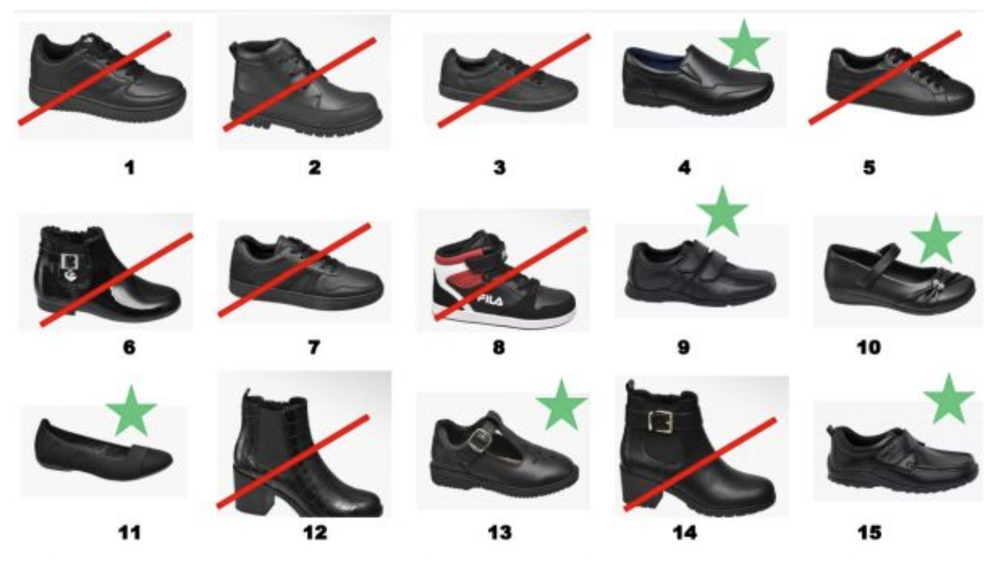 Some parents have asked for clarification about which shoes are appropriate for school. The image below provides exemplars of shoes which are/are not appropriate. Shoes should be black, flat, and shoes rather than boots. They should not be trainers of any colour.