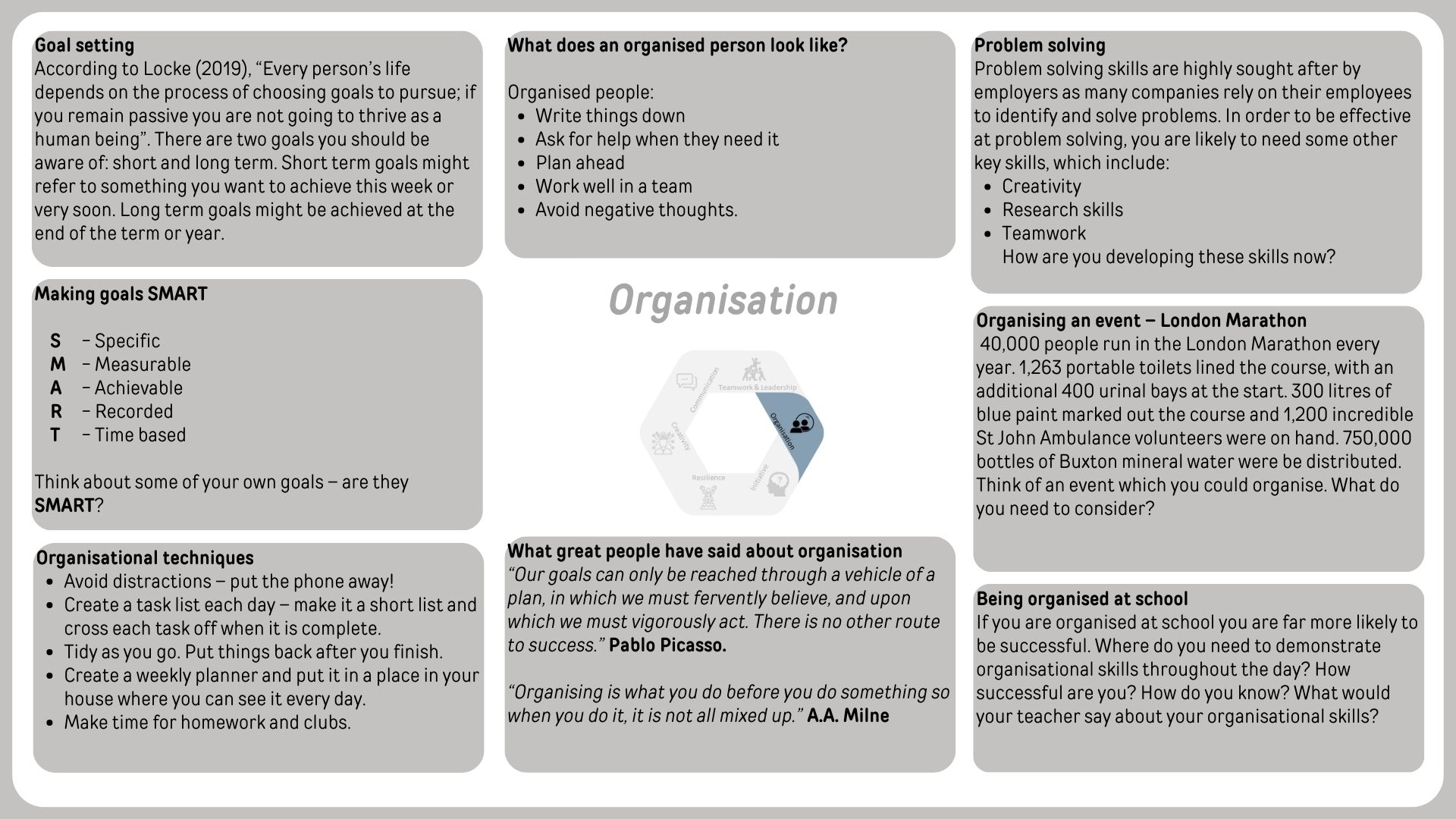 These are skills that we are always building up and developing. You will find that in all your subjects your teachers will talk to you about each of these skills as they arise. You will also notice that these skills are developed in all the areas listed below the symbol. Each of the key skills will be linked to a PSHE unit and there will be a focus each half term on developing that skill across the entire school.